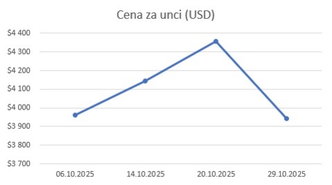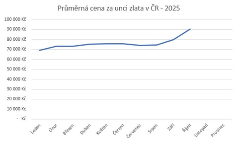 Na konci září se průměrná cena za unci zlata pohybovala kolem 83 089 Kč. V říjnu však zlato dále posilovalo, kdy 6. října už stálo 86 106 Kč a 14. října vystoupalo na 91 322 Kč. Vrcholu dosáhlo 20. října, kdy se prodávalo za 93 701 Kč za unci. Ke konci měsíce však část zisků odevzdalo a 29. října se cena pohybovala kolem 88 294 Kč za unci.