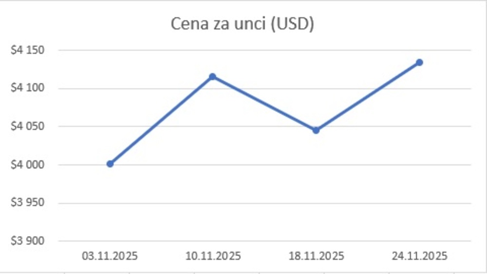 Graf vývoje ceny zlata ve světě za listopad 2025